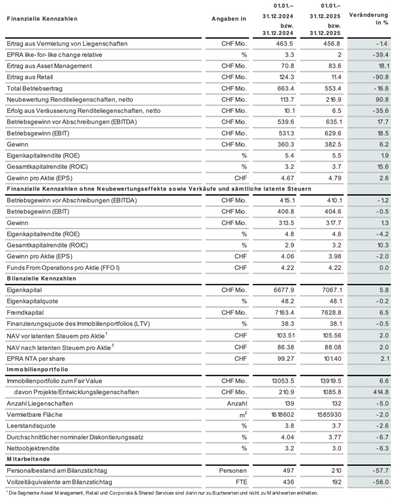 - Wert eigenes Immobilienportfolio +6.6% auf CHF 13.9 Mrd. per Ende 2025 widerspiegelt Zukäufe nach Kapitalerhöhung, positive Neubewertungseffekte sowie Verkäufe