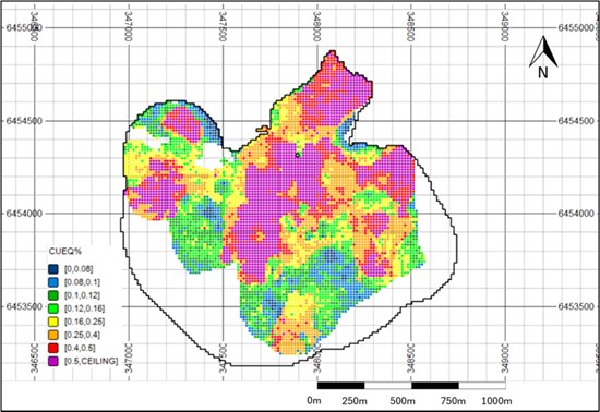 Abbildung 1: Draufsicht in 715m ü. d. M auf das Blockmodell, die die Verteilung des äquivalenten Kupfergehalts innerhalb der optimierten 120 Kilotonnen pro Tag (kt/T) Pit-Shell-Umrisse zeigt (UTM-Zone 9N [NAD 83]) Um eine verbesserte Version dieser Grafik anzuzeigen, bitte besuchen Sie URL: Abbildung 2: Schnitt von Osten 348000mit Blick nach Westen auf das Blockmodell, der die Verteilung des äquivalenten Kupfergehalts innerhalb der optimierten 120 kt/T Pit-Shell-Umrisse zeigt (UTM-Zone 9N [NAD 83]) Um eine verbesserte Version dieser Grafik anzuzeigen, bitte besuchen Sie URL: Abbildung 3: Draufsicht in 715m ü. d. M auf das Blockmodell, die die Verteilung der äquivalenten Kupferklassifizierung innerhalb der optimierten 120 kt/T Pit-Shell-Umrisse zeigt (UTM-Zone 9N [NAD 83]) Um eine verbesserte Version dieser Grafik anzuzeigen, bitte besuchen Sie URL: Abbildung 4: Schnitt von Osten 348000mit Blick nach Westen auf das Blockmodell, der die Verteilung der äquivalenten Kupferklassifizierung innerhalb der optimierten 120 kt/T Pit-Shell-Umrisse zeigt (UTM-Zone 9N [NAD 83]) Um eine verbesserte Version dieser Grafik anzuzeigen, bitte besuchen Sie URL: Die Hat-Lagerstätte Die Hat-Claims-Liegenschaft besteht aus 16 Mineralkonzessionen, die 13.823,09 Hektar nördlich der Golden Bear Mine Road im Nordwesten von British Columbia abdecken. Weiter Informationen finden Sie unter www.doubleview.ca. Mineit Consulting Inc (Mineit) hat die MRE erstellt gemäß der CIM Definition Standards on Mineral Resources and Reserves on Mineral Resources. Ein technischer Bericht zur Unterstützung der MRE wird innerhalb von 45 Tagen bei SEDAR+ (www.sedarplus.ca) eingereicht. Tomasz Wawruch, FAusIMM, von Mineit ist die Qualifizierte Person für die MRE und hat die in dieser Pressemitteilung enthaltenen technischen Angaben zur MRE geprüft und genehmigt. Herr Wawruch ist ein Berater für Geologie und Mineralressourcen und ist unabhängig von Doubleview. Gilles Arseneau, PhD., P.Geo von ARSENEAU Consulting Services Inc. führte eine unabhängige Begutachtung der MRE durch und fand keine gravierenden Mängel am Ressourcenmodell von Tomasz Wawruch. In Bezug auf die metallurgischen Studien des Hat-Projekts ist EUR ING Andrew Carter, B.Sc., CEng., MIMMM QMR, MSAIMM SME von Magister Metallurgy die Qualifizierte Person von Doubleview, wie in National Instrument 43-101 Standards of Disclosure for Mineral Projects definiert; er hat den technischen Inhalt dieser Pressemitteilung geprüft und genehmigt. Herr Carter ist unabhängig von Doubleview. Über Doubleview Gold Corp. Doubleview Gold Corp, ein Unternehmen zur Exploration und Erschließung von Mineralressourcen, hat seinen Sitz im kanadischen Vancouver, British Columbia, und wird an der TSX Venture Exchange (TSXV: DBG), am OTCQB (OTCQB: DBLVF), an der Börse Berlin (GER: A1W038) und an der Börse Frankfurt (1D4) öffentlich gehandelt. Doubleview identifiziert, erwirbt und finanziert Edel- und Basismetall-Explorationsprojekte in Nordamerika, insbesondere in British Columbia. Das Unternehmen schafft Mehrwert für seine Aktionäre durch den Erwerb und die Exploration von hochwertigen Gold-, Kupfer- und Silberliegenschaften-zusammengefasst kritische Mineralien- und die Anwendung fortschrittlicher, moderner Explorationsmethoden. Doubleviews Portfolio an strategischen Liegenschaften sorgt für Diversifizierung und mindert das Investitionsrisiko. Im Namen des Vorstandes, Farshad Shirvani, President & CEO Für weitere Informationen wenden Sie sich bitte an: Doubleview Gold Corp Farshad Shirvani Institutionsanschluss: (604) 607-5470 WEDER DIE TSX VENTURE EXCHANGE NOCH IHR REGULIERUNGSDIENSTLEISTER (ENTSPRECHEND DER DEFINITION IN DEN RICHTLINIEN DER TSX VENTURE EXCHANGE) ÜBERNEHMEN DIE VERANTWORTUNG FÜR DIE ANGEMESSENHEIT ODER RICHTIGKEIT DIESER MITTEILUNG. Einige der hierin enthaltenen Aussagen und Informationen können „zukunftsgerichtete Informationen“ darstellen. Insbesondere Verweise auf die Mineralressourcenschätzung und künftige Arbeitsprogramme oder Erwartungen an die Qualität oder Ergebnisse solcher Arbeitsprogramme unterliegen Risiken im Zusammenhang mit dem Betrieb auf der Liegenschaft, Explorationsaktivitäten im Allgemeinen, Beschränkungen und Verfügbarkeit von Ausrüstung sowie anderen Risiken, die uns möglicherweise derzeit nicht bekannt sind. Leser*innen werden also darauf hingewiesen, sich nicht unangemessen auf zukunftsgerichtete Informationen zu verlassen. Sofern nicht nach geltendem Wertpapierrecht erforderlich, übernimmt das Unternehmen keine Verpflichtung, zukunftsgerichtete Informationen öffentlich zu aktualisieren oder zu überarbeiten, ob aufgrund neuer Informationen, künftiger Ereignisse oder anderweitig.