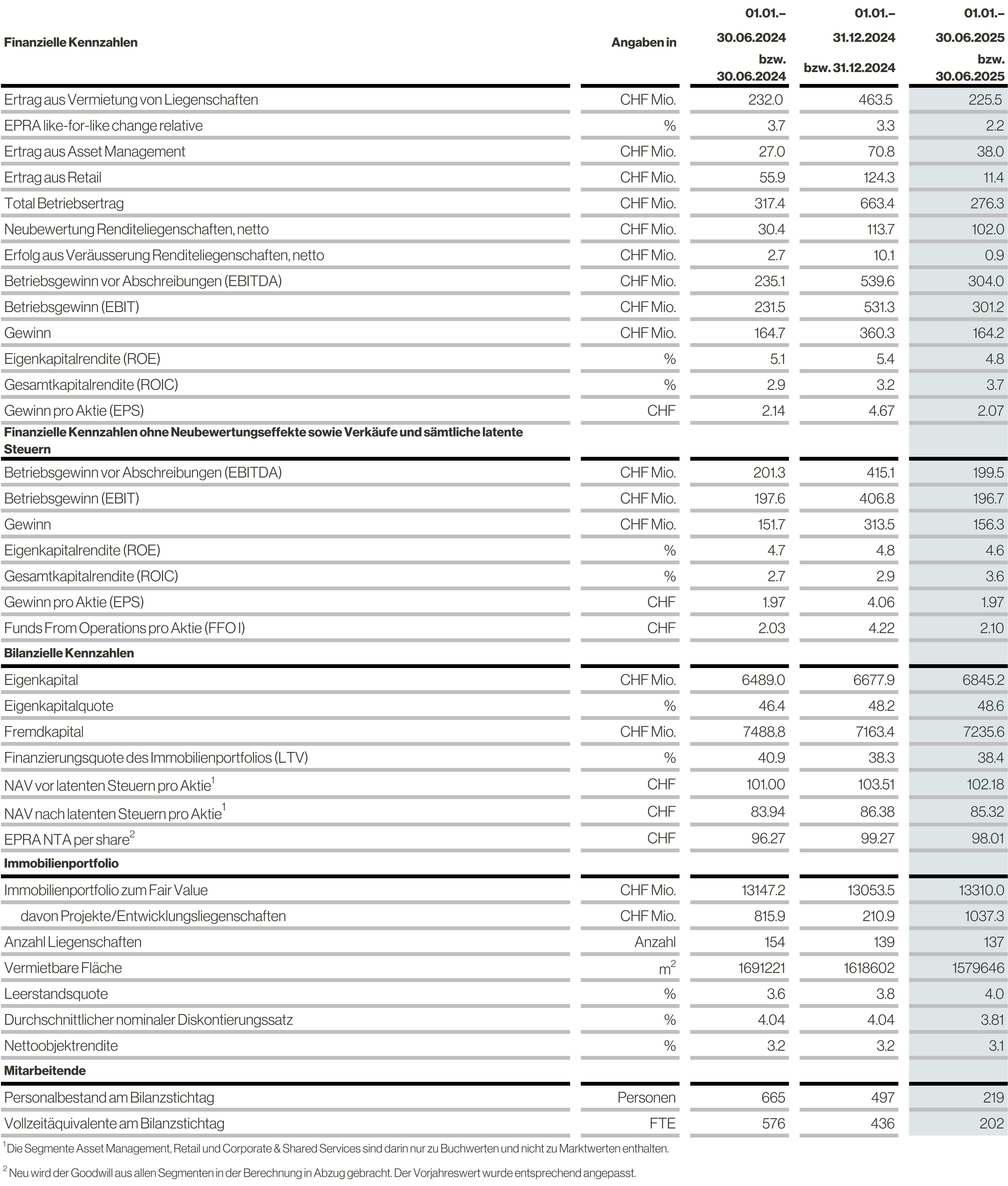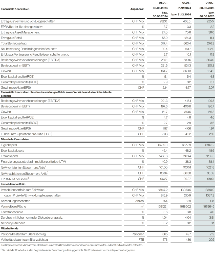 Die totalen Zinsaufwände gingen zum ersten Mal seit der Zinswende von 2022 zurück. Sie lagen für das erste Halbjahr 2025 bei CHF 27.5 Mio. und so fast 17% unter Vorjahr. Der durchschnittliche Zinssatz lag mit 0.98% [Vorjahr 1.16%] seit längerem wieder unter der Schwelle von einem Prozent. Der Finanzaufwand beinhaltet neben den Zinskosten nicht zahlungswirksame Fair-Value-Anpassungen der letzten ausstehenden Wandelanleihe i.H.v. CHF 65 Mio., eine direkte Folge des signifikant höheren Aktienkurses zum Ende des Halbjahres. Insgesamt resultierte damit ein Ergebnis vor Neubewertungen und Verkäufen von CHF 156.3 Mio. [CHF 151.7 Mio.].